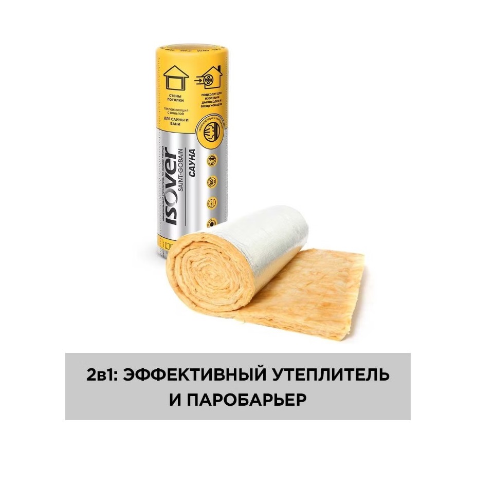 Утеплитель Isover Сауна, 50мм- эффективный утеплитель и паробарьер разработан специально для бани и сауны. Фольгированный слой на минеральной вате дольше сохраняет заданную температуру, позволяет удерживать пар в парилке и предотвращает проникновение сырости. Не требует дополнительного монтажа мембран и пленок.